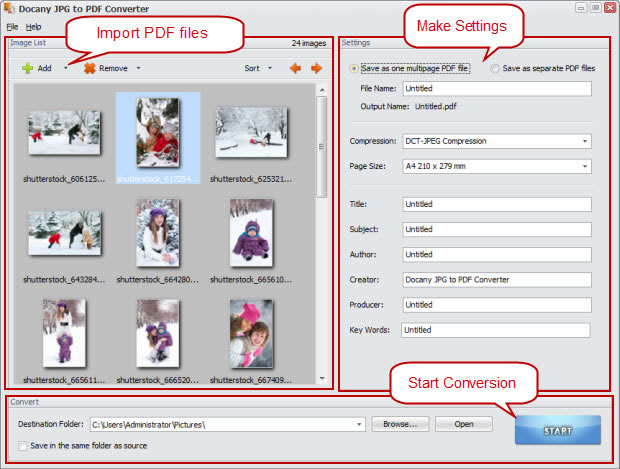 Docany JPG to PDF Converter is an easy-to-use software, which can directly used for batch convert a large number of image formats such as JPG, GIF, PNG, BMP, TIFF and so on, into PDF file. Only need a few mouse clicks, it could convert hundreds of JPG images to PDF. With Docany JPG to PDF Converter you can easily combine multiple JPG images into one PDF file or convert each JPG file into a separate PDF file.